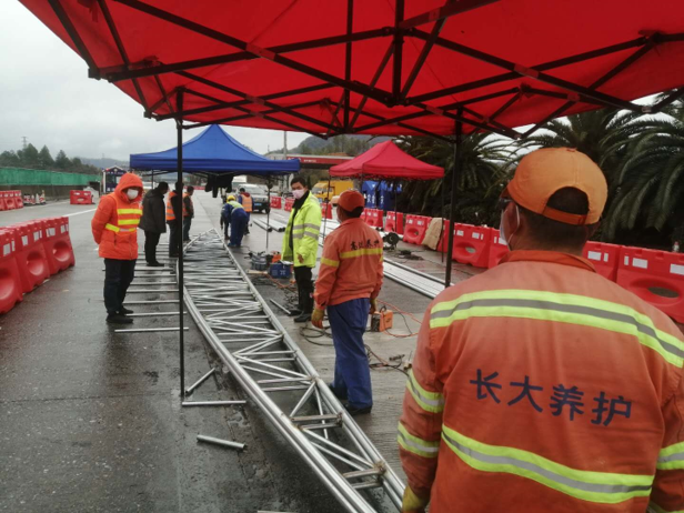 春运返程高峰期间,保利长大养护公司接到任务,第一时间组织抗疫队伍,仅用1小时完成车道扩增任务,连夜搭建防疫检测帐篷,倾力支持、配合二广、京珠北、粤赣等高速开展防疫检测工作,在高速公路省界站抗“疫”一线鏖战25天,肩负起严防输入、保畅春运的双重任务。
