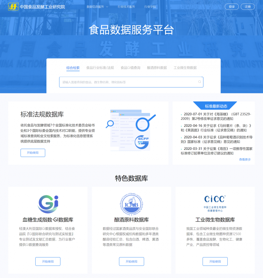 7月30日,中国食品院数据服务平台上线试运行。该平台提供围绕核心业务的数据信息服务,涵盖标准/技术法规、GI(血糖生成指数)、酿酒原料和工业微生物4个专项数据库检索服务和行业数据查询服务,还提供食品和发酵行业的技术服务信息和资讯等服务。