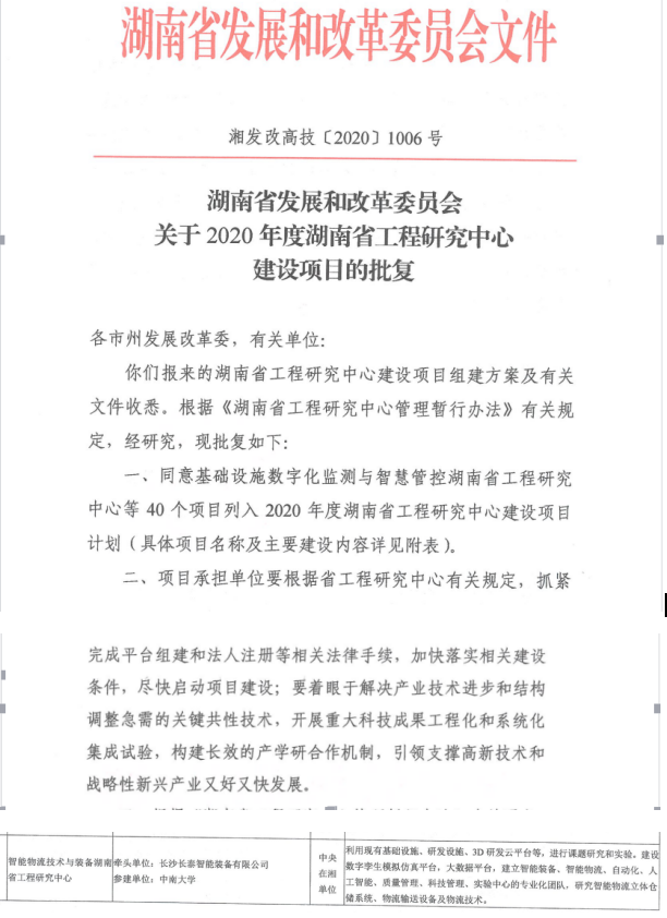 近日,湖南省发改委下发了《2020年度湖南省工程研究中心建设项目的批复》文件,中轻集团长泰公司获批“智能物流技术与装备湖南省工程研究中心”。该中心依托长沙长泰智能装备有限公司建设,积极开展物联网、大数据、AI技术与物流装备等融合深入研究和应用,进一步促进科研创新成果转化。